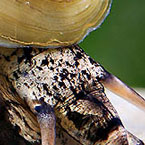 The snail’s soft body is divided into three distinct sections. A well-defined head is connected to a large muscular foot. The foot is the most visible external feature of the snail’s body and is the animal’s mode of locomotion. A snail propels itself with this single foot, which is controlled by hydrostatic action inside the snail’s body. Additionally, the foot surface is covered with tiny projections (cilia) that assist the gliding motion. Snails feed along the bottom as they move, partially clearing a path for the foot. As the foot passes over the substrate, it leaves a “trail” behind the snail. These trails are commonly visible in soft sediments or across hard surfaces such as rocks or submerged trees.
